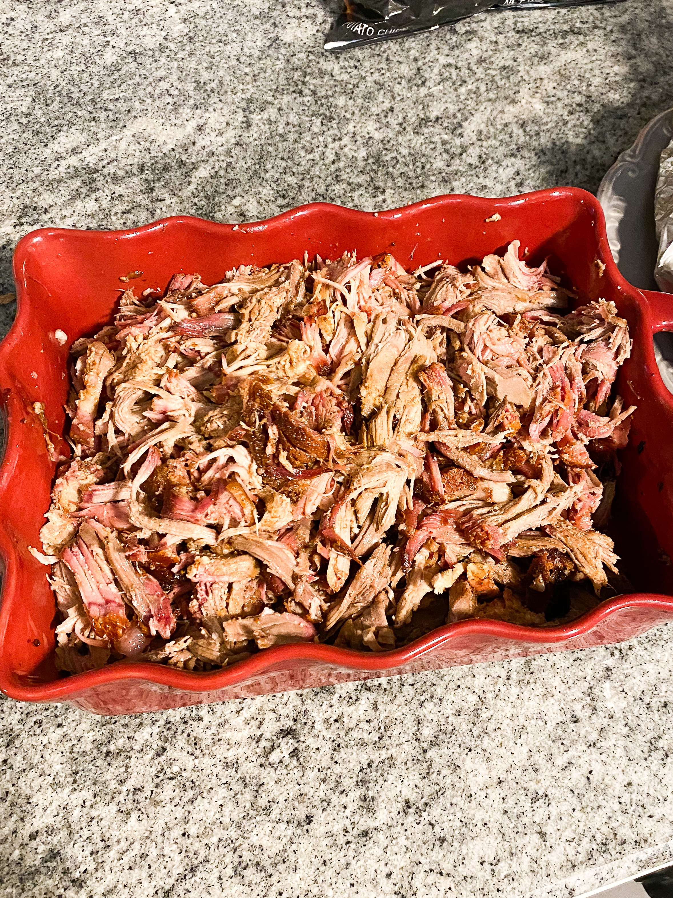 At this point, feel free to add a little BBQ sauce and mix it in. You are now finished smoking a pork shoulder and are the king of the tailgate!