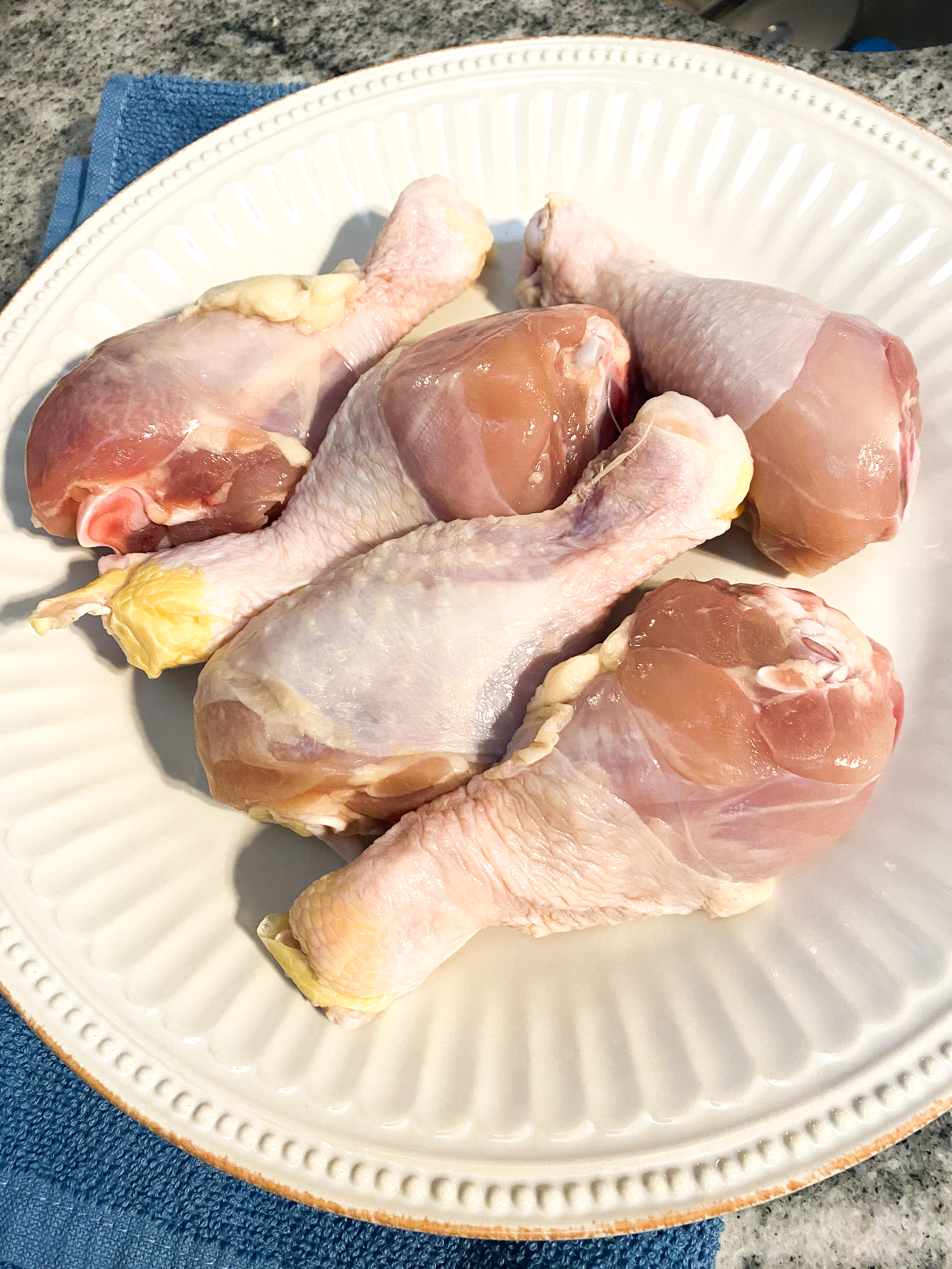 For our cook, I used chicken drumsticks from our monthly Butcher Box. As always when cooking meat, allow the chicken to get as close to room temperature as possible before placing in the oven or on grill. Set the refrigerated chicken on the counter for about 20-30 minutes.