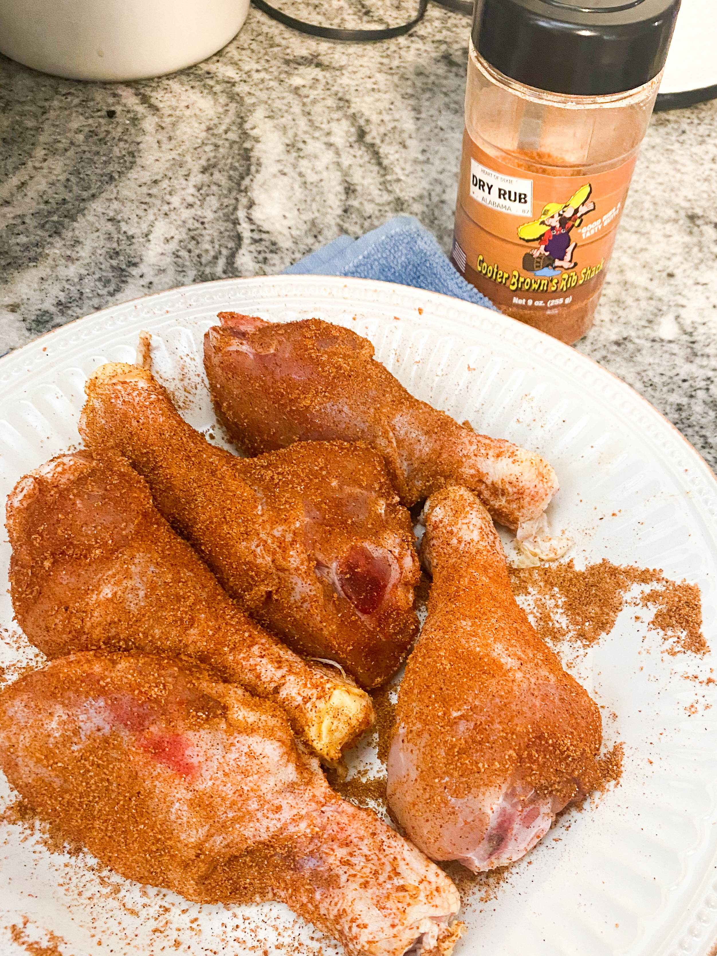 Once the chicken has set at room temp, preheat the oven to 400 degrees Fahrenheit, and place your cast iron skillet in the oven while it is preheating. Next, you’ll want to rinse your drumsticks and pat dry. I’ve found this helps the seasoning to stick to the chicken much easier. For this cook, I used our Cooter Brown’s smoky dry rub. *Be sure when seasoning your chicken that you get all sides. With the round drumsticks, it’s easy to miss a spot.*
