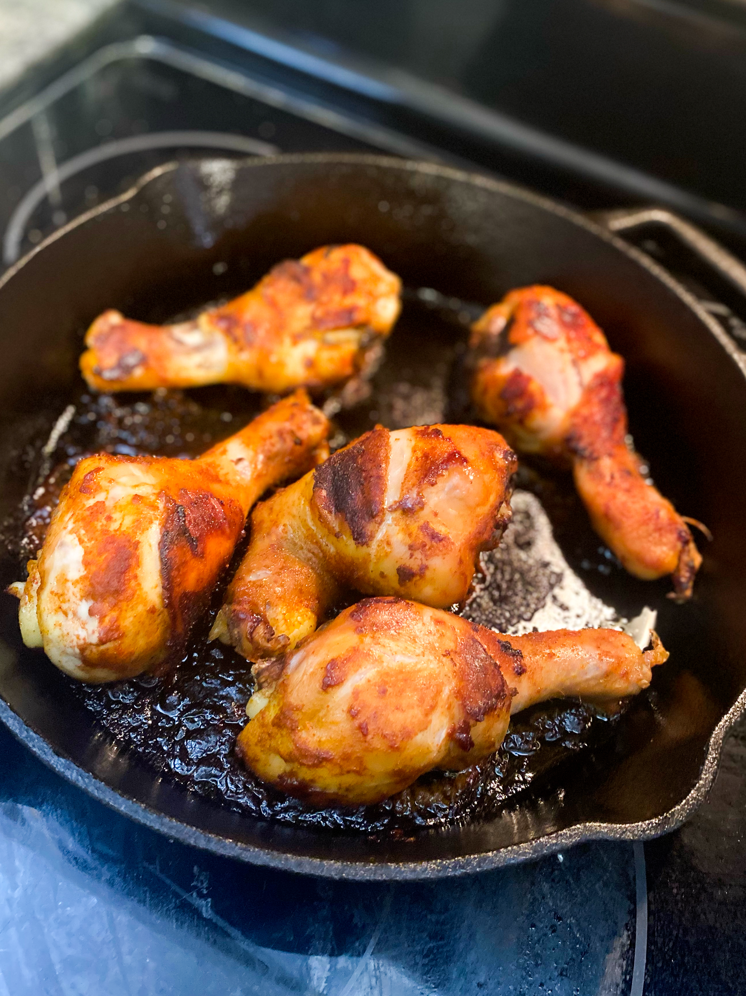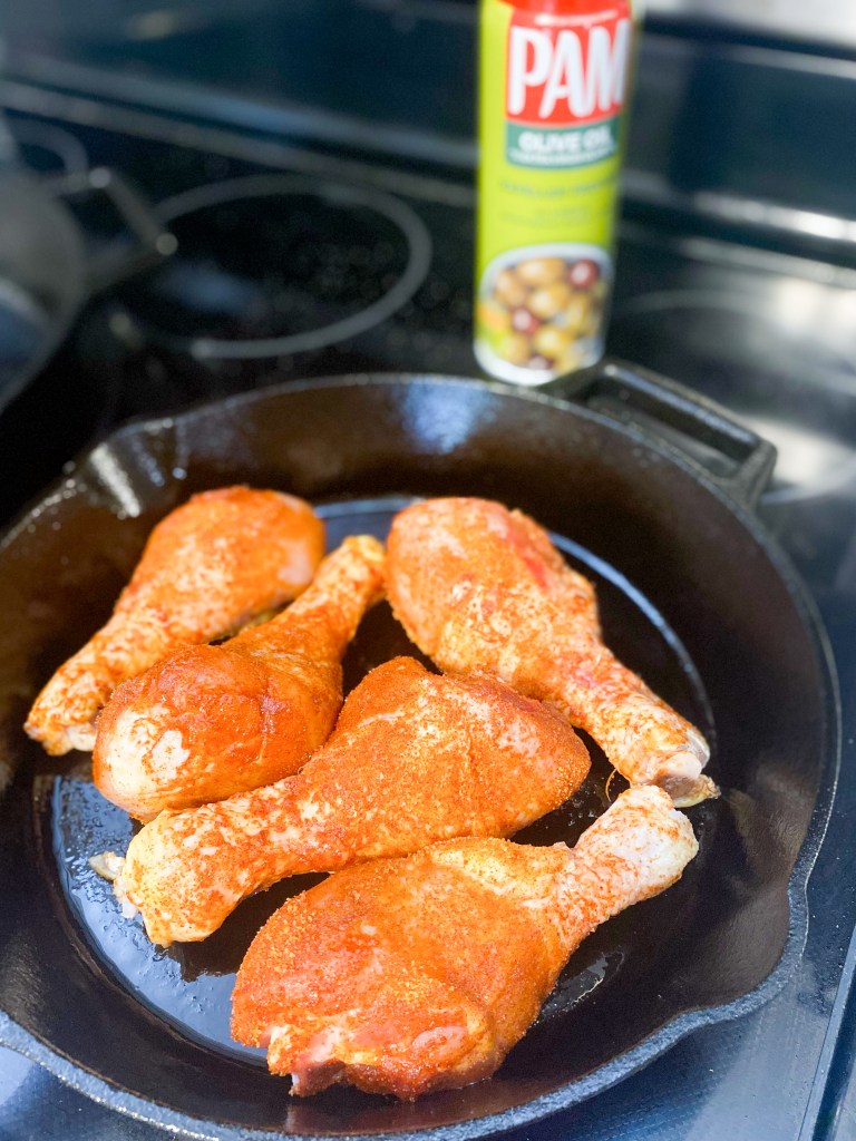 When the oven is preheated, take the cast iron out, spray lightly with olive oil, and place your drumsticks in the skillet. These should sizzle a tad with the hot cast iron, and should make a nice crust on the side. Place the pan in the oven and cook for 45 minutes.