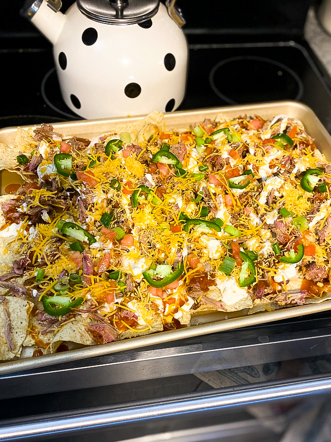 My wife loves BBQ nachos, so we made sheet pan nachos with some of our pork (we’ll post a recipe soon).